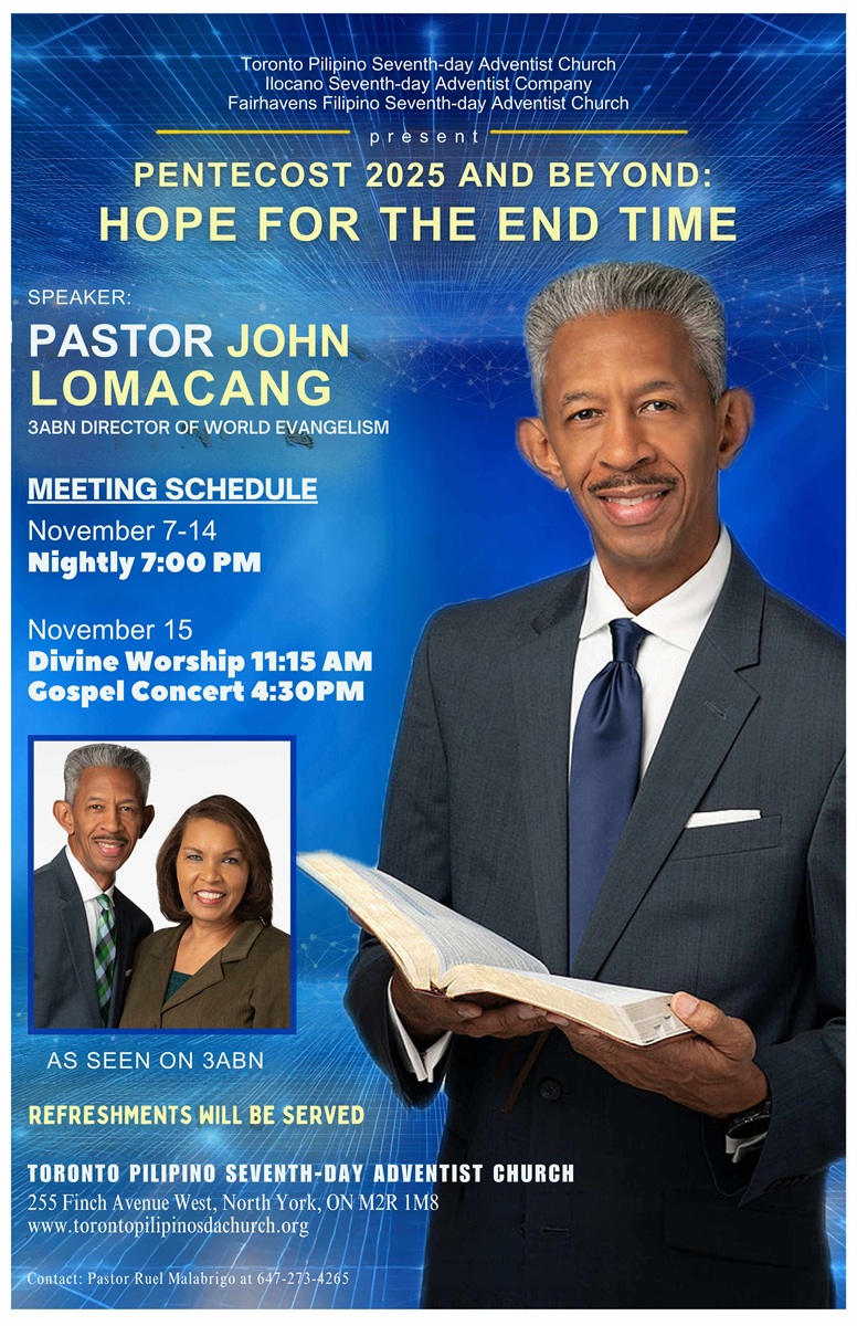 From November 7 to 15, 2025, the Toronto Pilipino Seventh-day Adventist Church became a place of renewed hope, unwavering faith, and unmistakable spiritual power as three congregations came together for Pentecost 2025 and Beyond: Hope for the End Time. In partnership with Fairhavens Filipino Seventh-day Adventist Church and the Ilocano Seventh-day Adventist Company, the week-long evangelistic series drew hearts back to God and reminded everyone that the Holy Spirit is still moving mightily today.